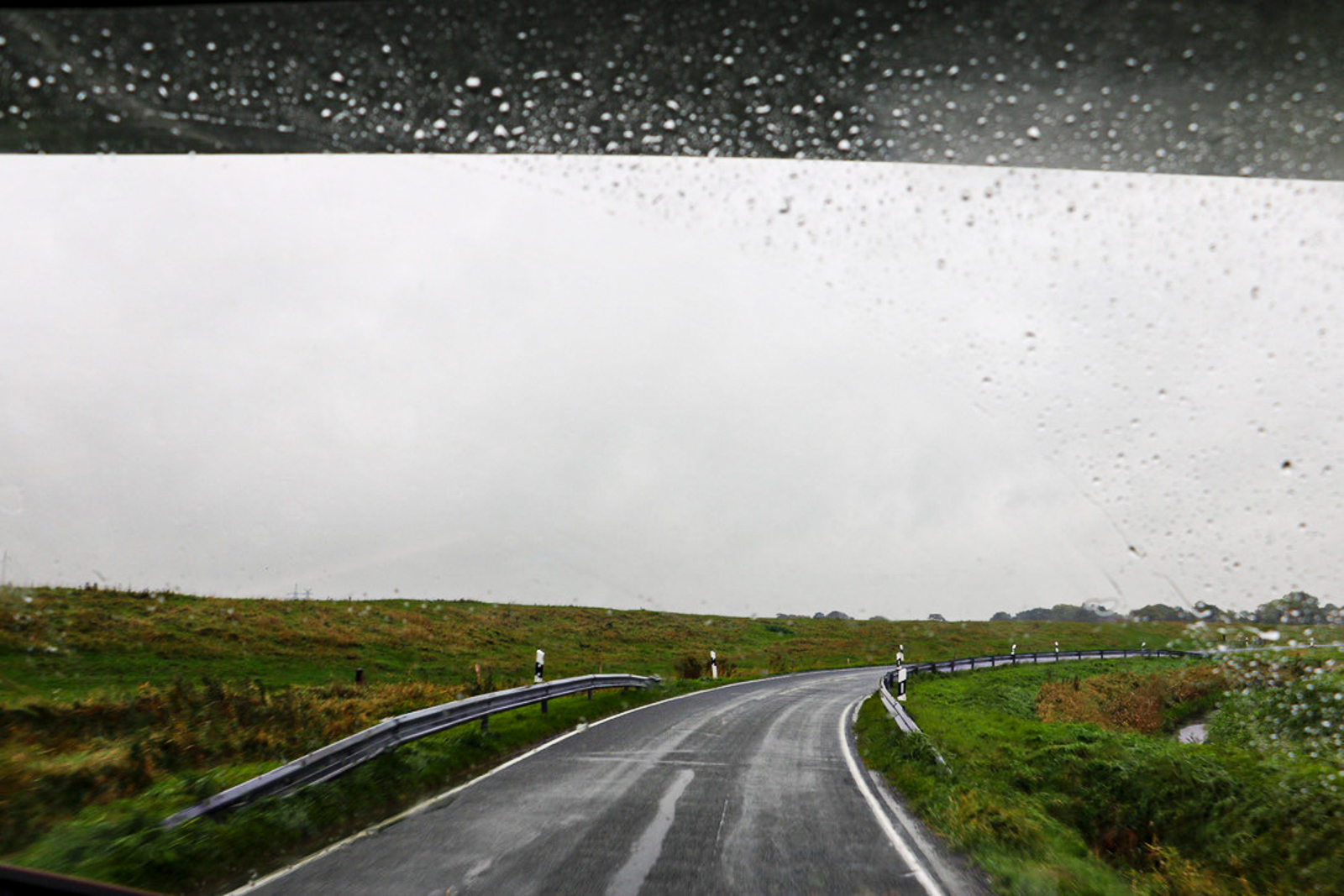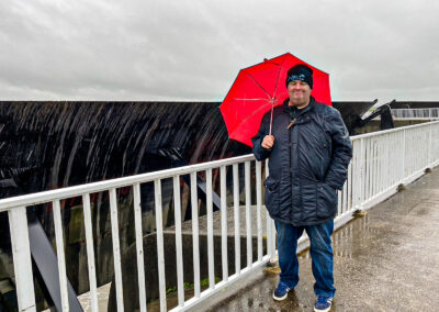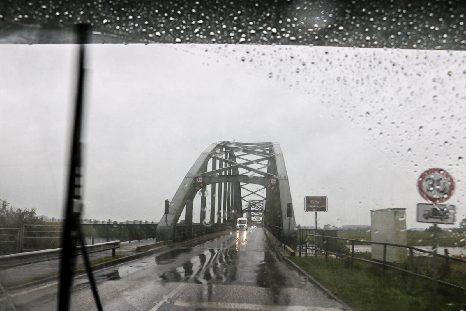 Wind und Regen am Eidersperrwerk Als wir ankommen, ist es windig und der Regen hört nicht auf. Mit Regenschirmen bewaffnet, erkunden wir das Sperrwerk. Der Wind ist so stark, dass wir fast mit den Schirmen abheben – es ist richtig pustig! Komplett durchnässt, vor allem an den Hosenbeinen, machen wir uns auf den Weg zurück zum Wohnmobil. Einmal kurz ausgeschüttelt, drehen wir die Heizung auf und sind wieder bereit.