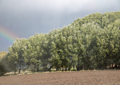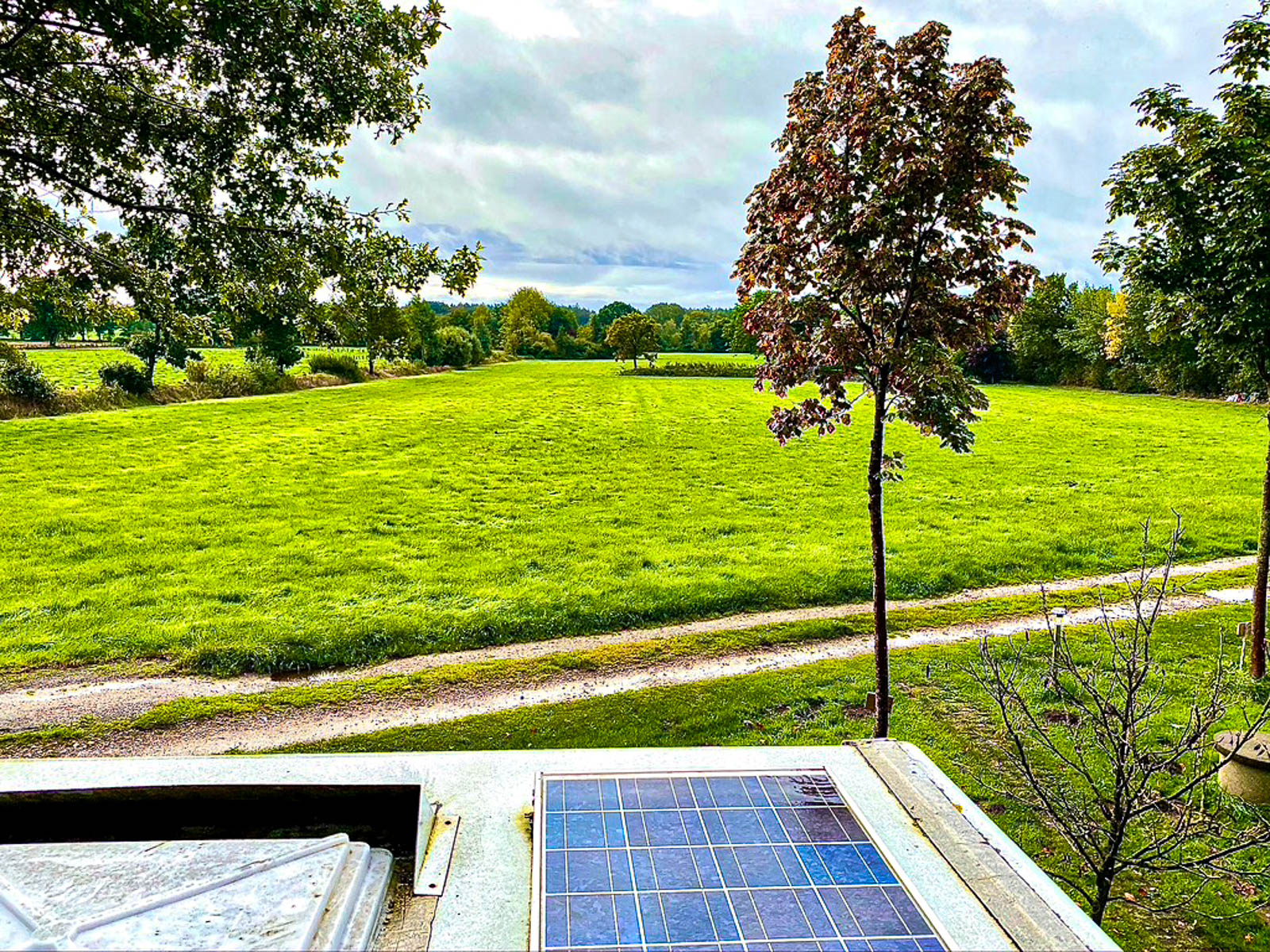 Wir setzen unsere Fahrt fort, übersehen jedoch die Einfahrt zum Ferienhof Sievers und müssen umkehren. Um 13:38 Uhr erreichen wir den Stellplatz in Steenfeld. Der Platz ist menschenleer. Nachdem wir am Haus vorbeigefahren sind, empfangen uns große Koppeln, und Bäume weisen uns den Weg zu den Stellplätzen. Wir entscheiden uns für Platz 2.