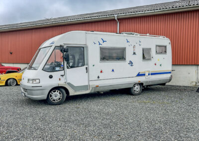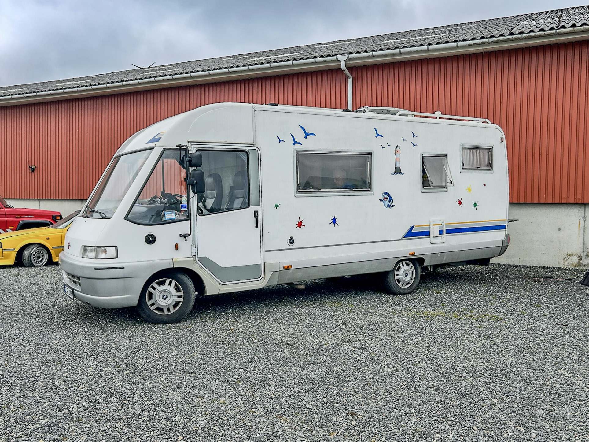 Ein leerer Stellplatz, ein nostalgisches Auto, Durchfall und dänische Hundeaction – klingt nach einem typischen Tag auf Tour. 😄